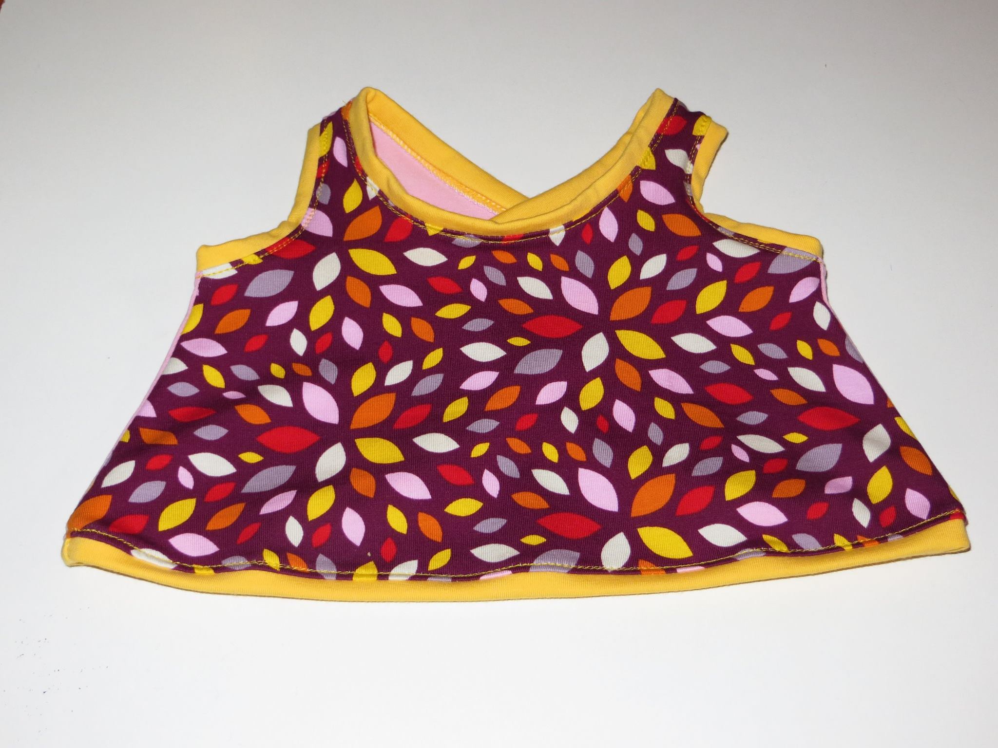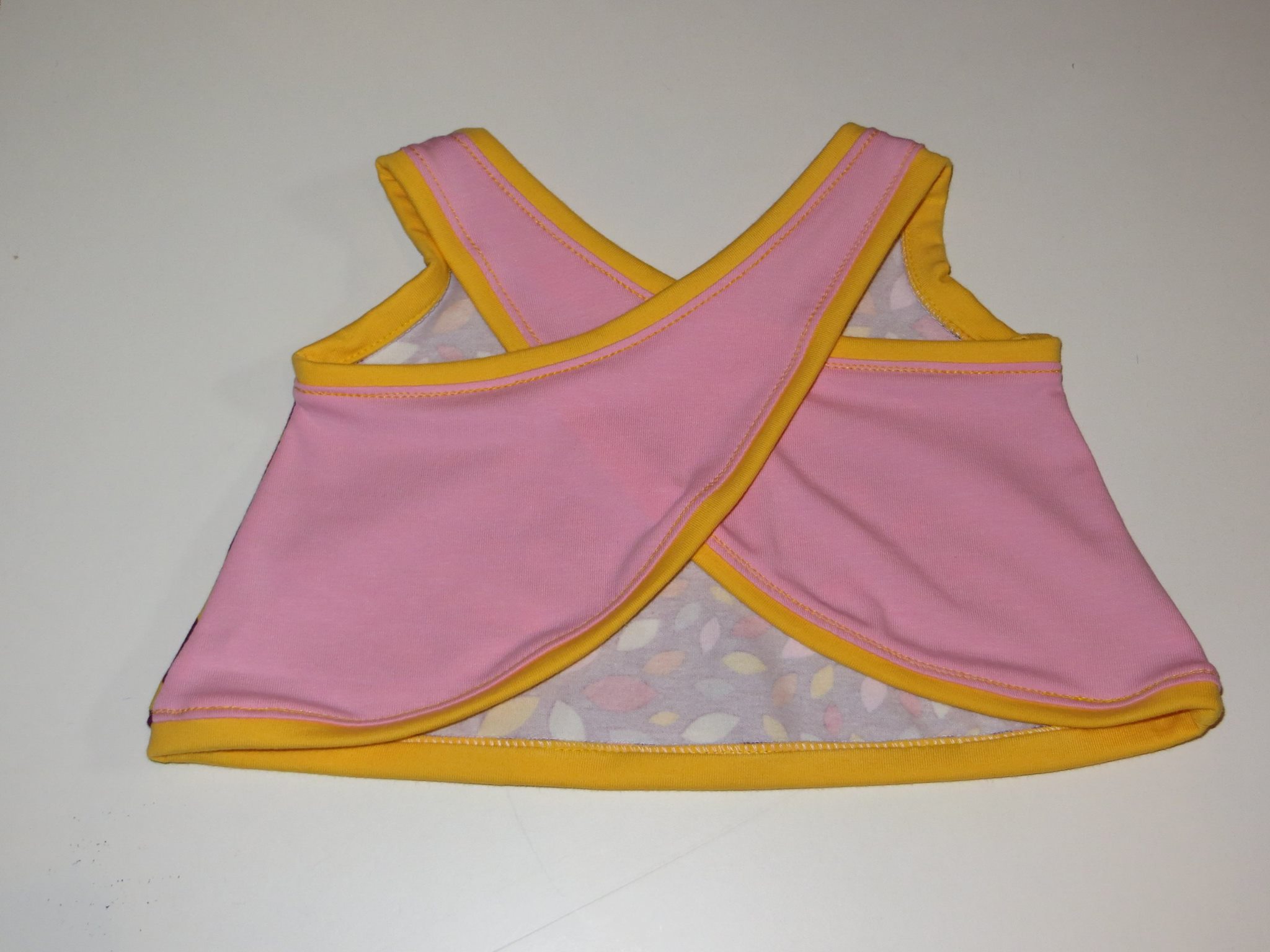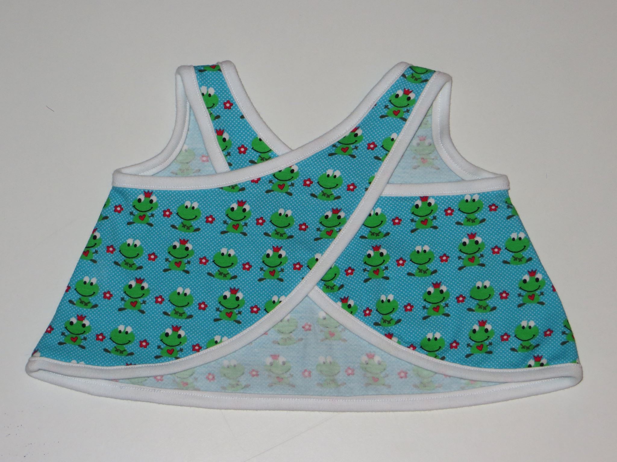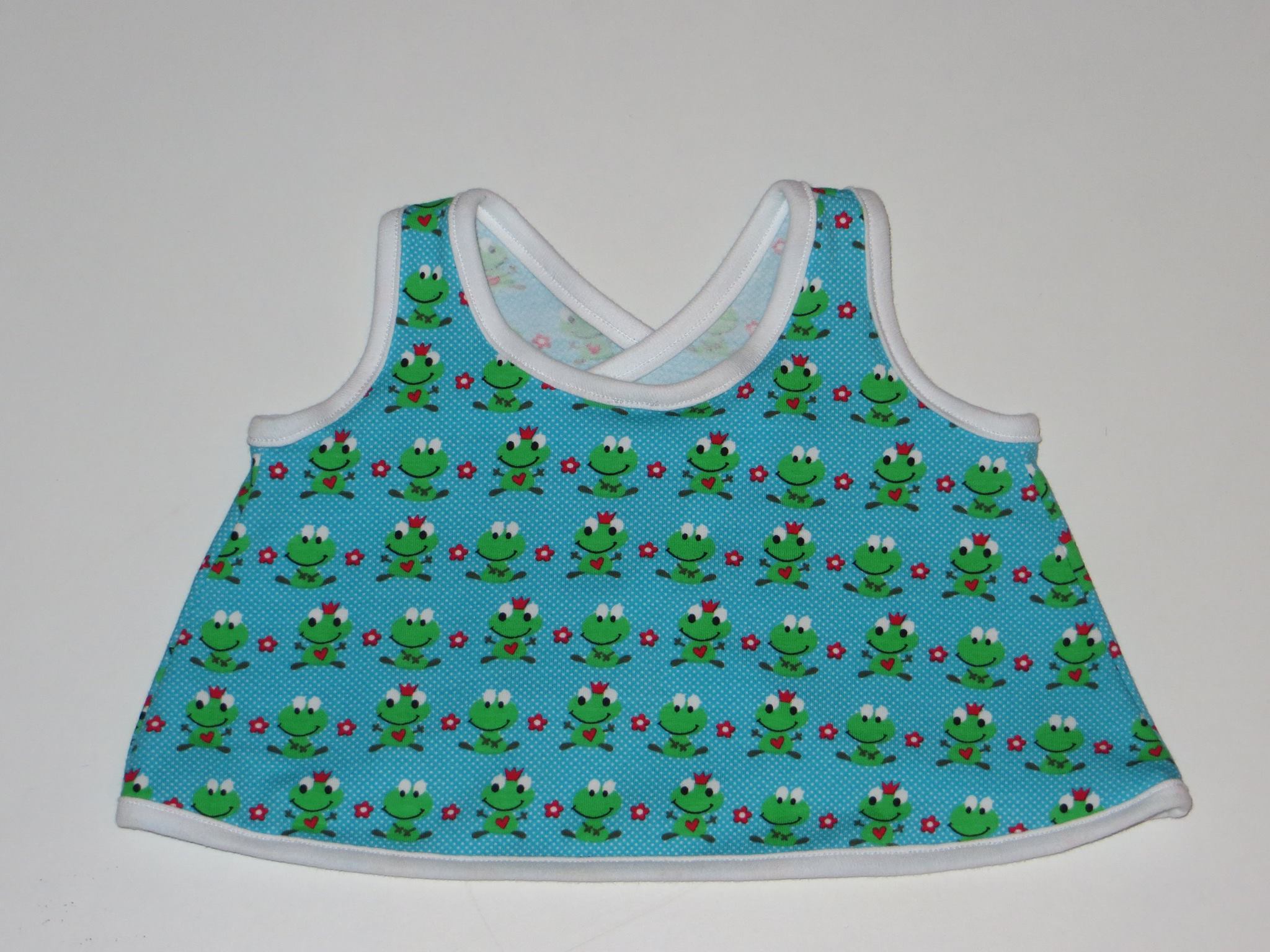 - Baby Trägerkleid, Probenähstück Baby Cross Top Größe 62 – Vorderseite Material: 95% Baumwolle, 5% Elasthan Waschen: 30°C Preis: 7,00 €