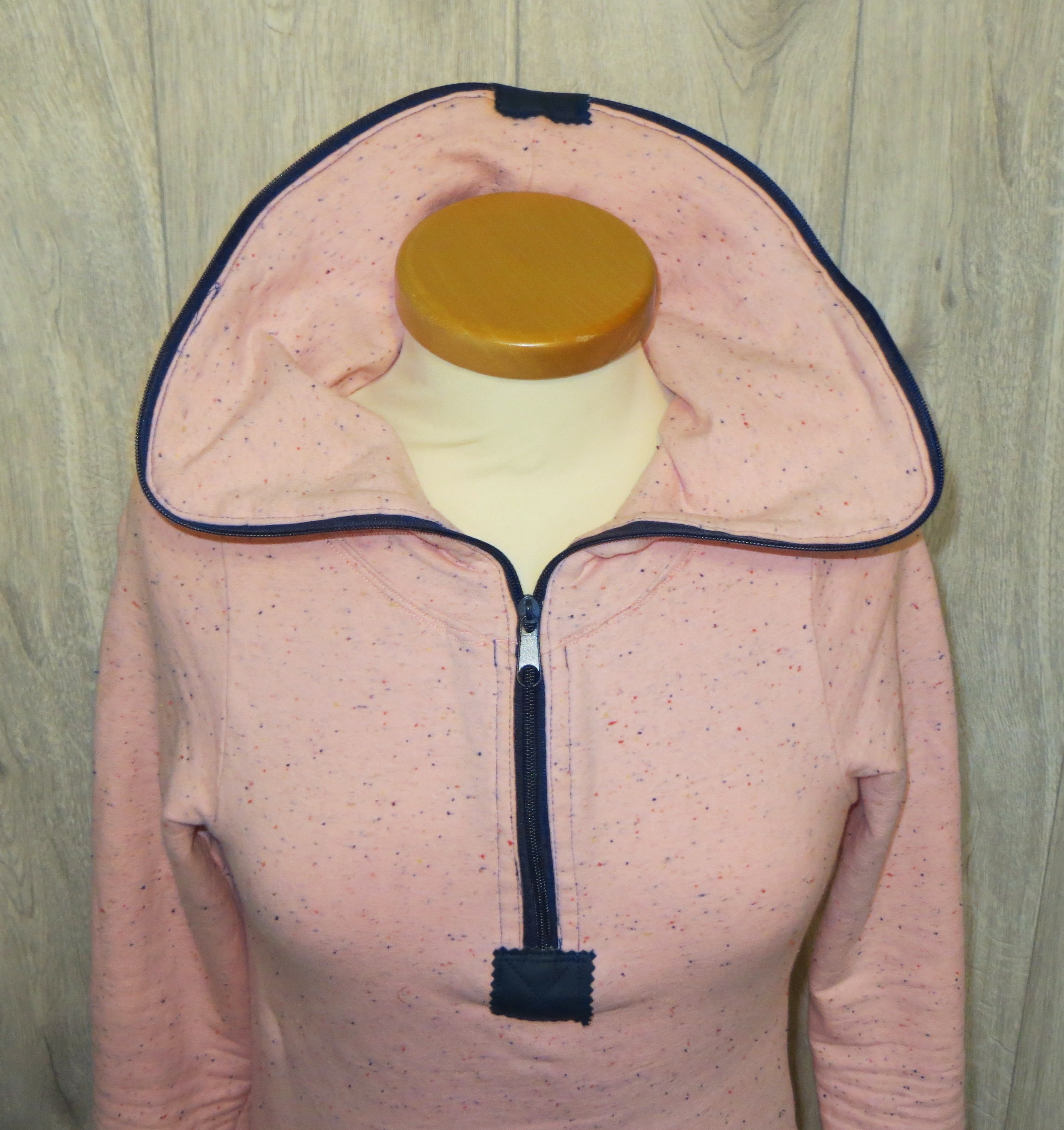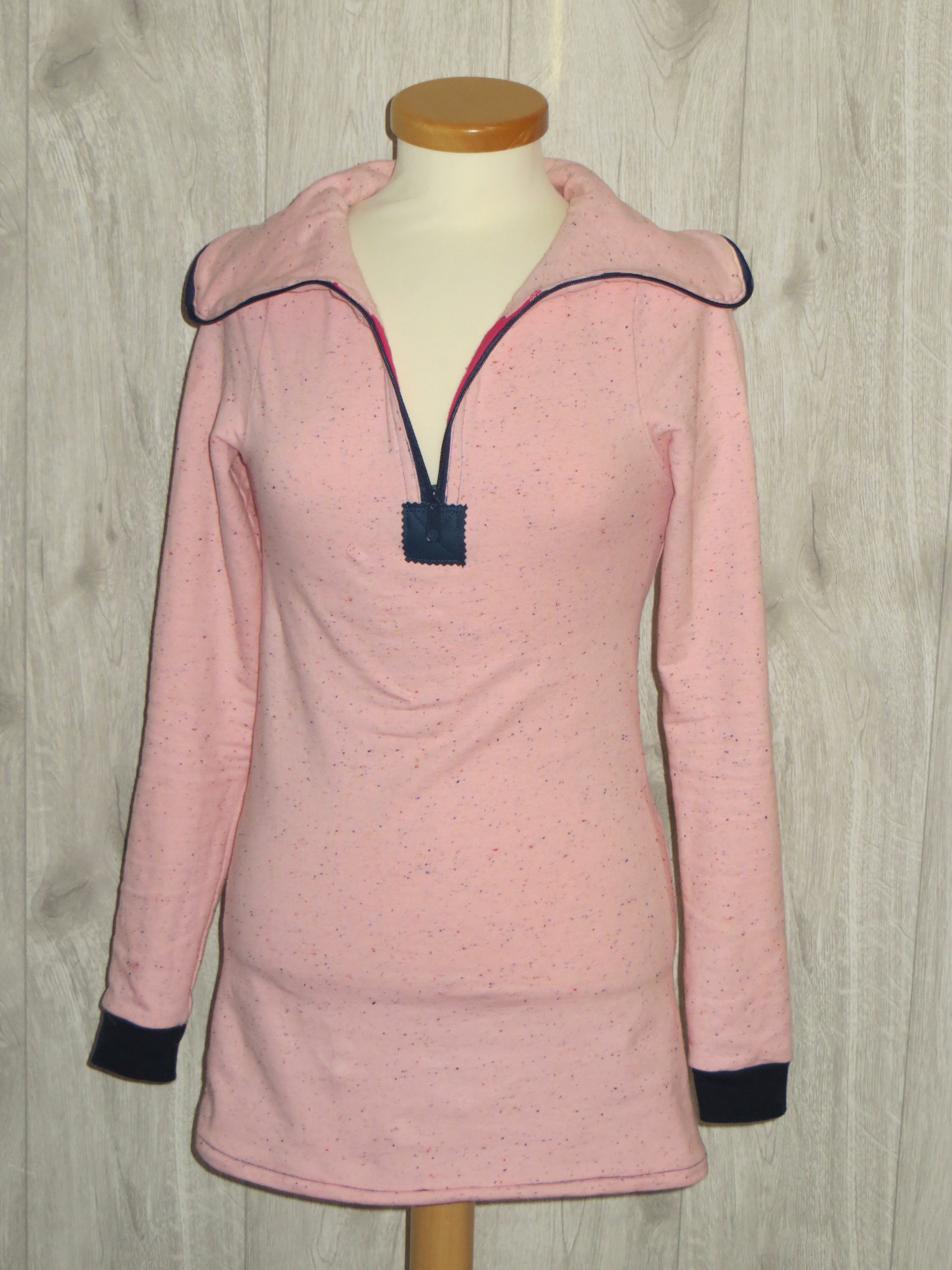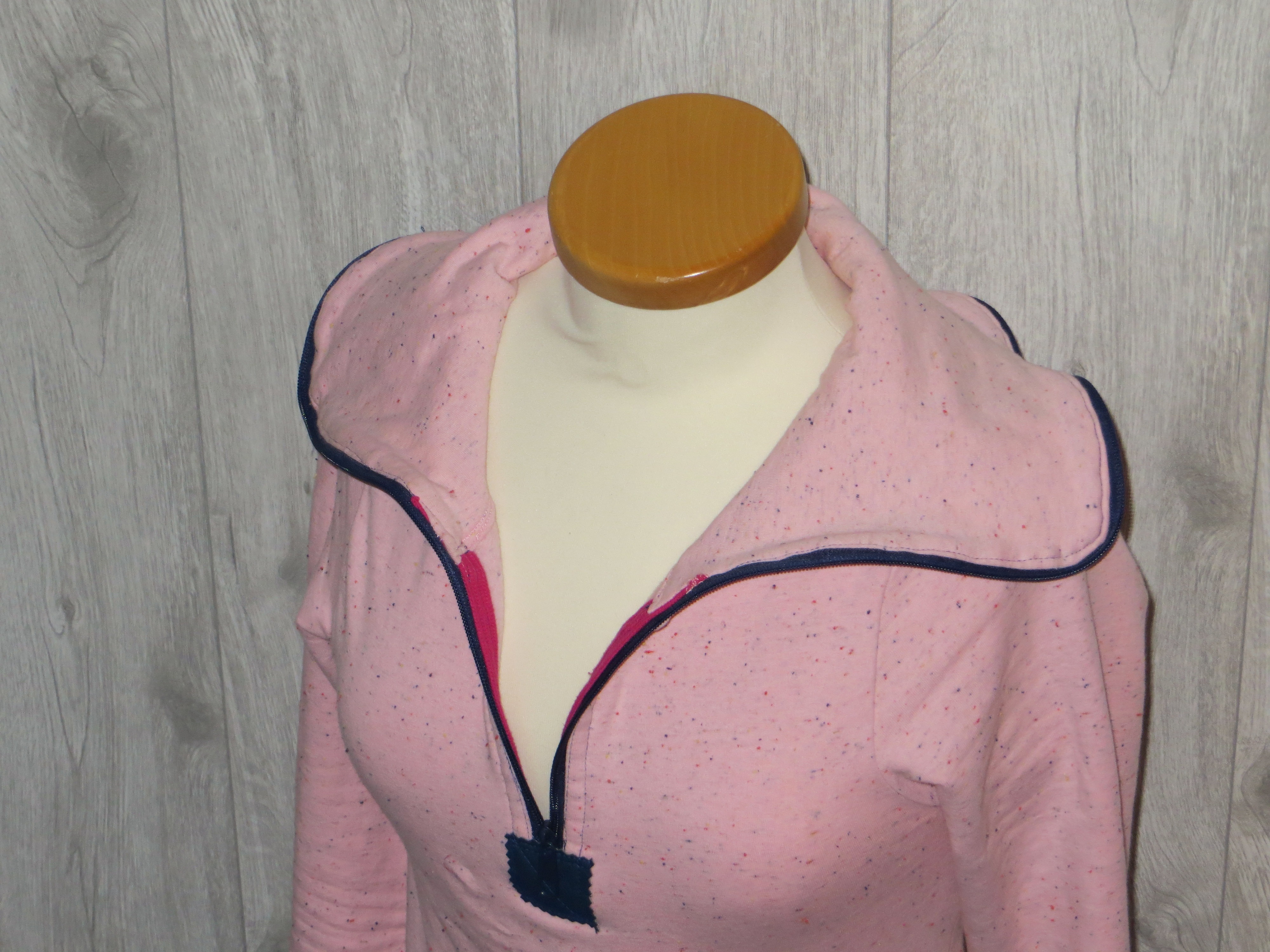 Für dieses kuschelige Exemplar habe ich Sprenkelsweat Cozy Colors geraut in rosa verwendet (ebenfalls von Aladina). Dazu passend einen dunkelblauen Reißverschluss, dunkelblaue Bündchen (ich mag die Ärmel immer ein wenig länger) und dunkelblaues Kunstleder .